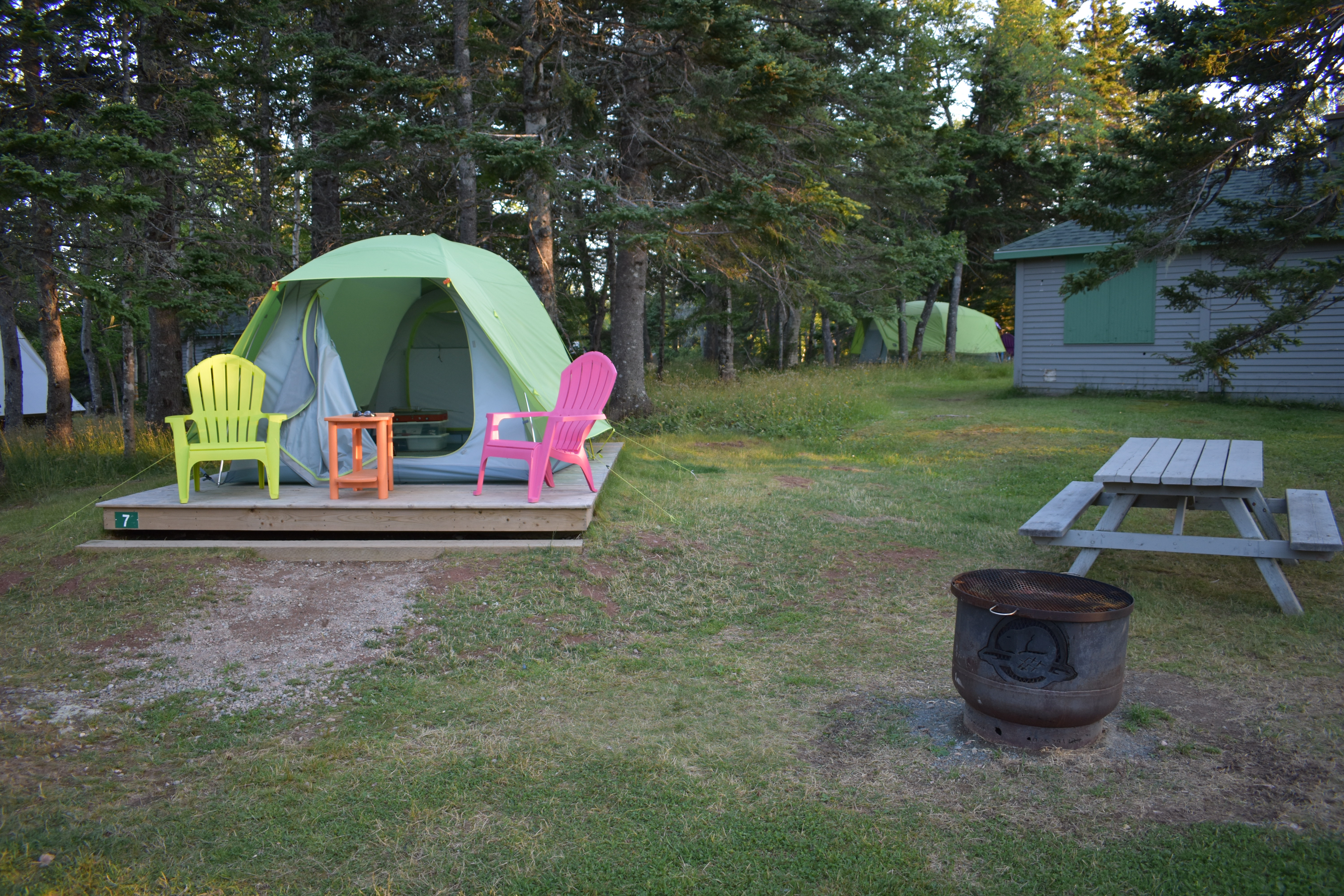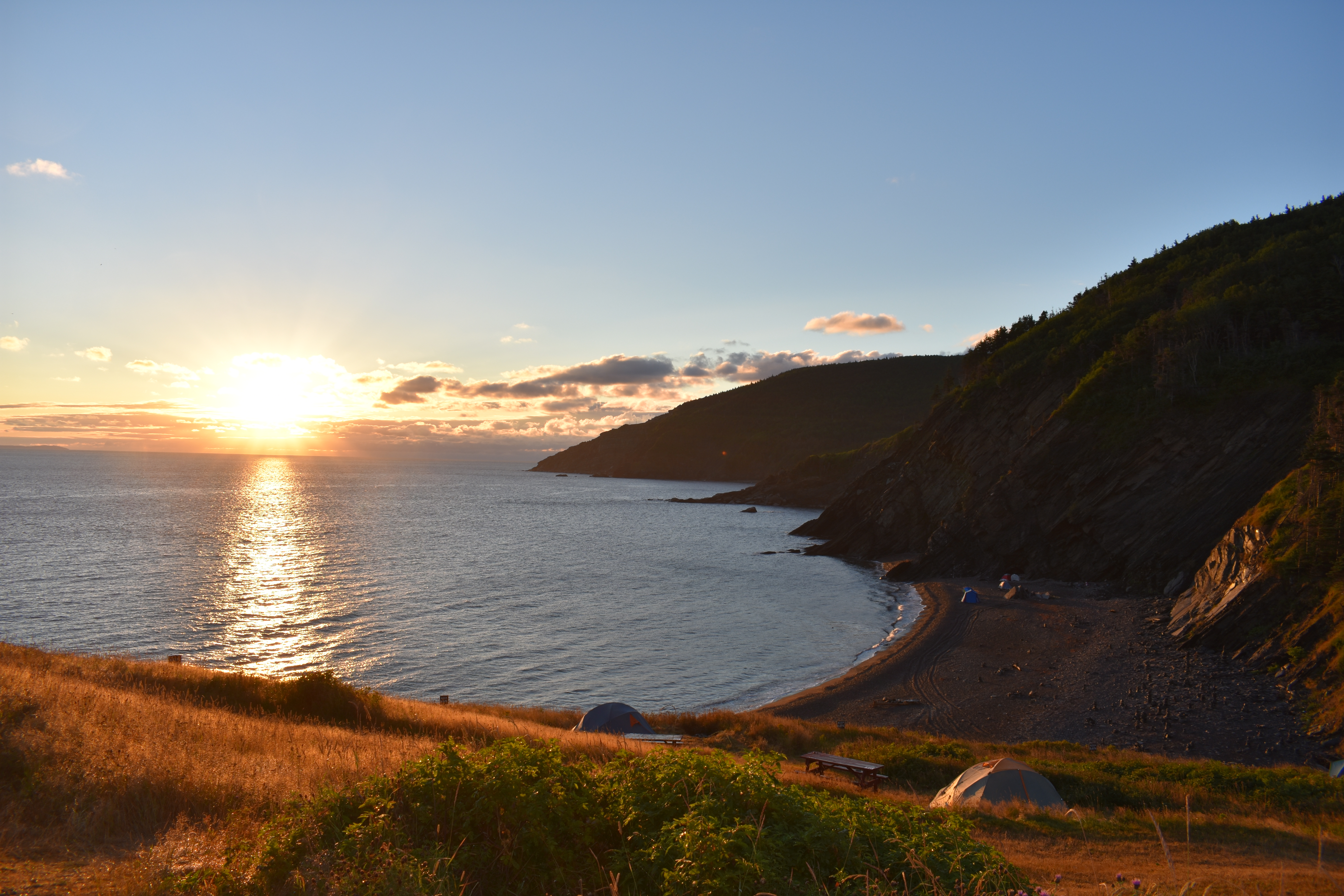 After watching the sunrise on our cabin porch, we hiked up the nearest cliff to watch the world below. We then drove over to the Skyline trail at Cape Breton Highlands National Park for a stunning panorama of the ocean. Later that night we camped in an equipped tent at Ingonish Beach (Parks Canada sets up the tent and provides the dishes, fire pit, and lanterns needed; it’s a really good set-up if you’re flying to the Maritimes).